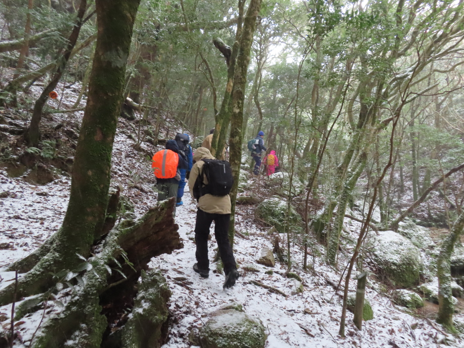 令和8年1月11日(日)、照葉樹の森月例登山会(稲尾岳)『安全祈願!稲尾神社へ初詣登山に出かけよう!』が開催されました。雪が降る中の登山会となり、安全を考慮して自然石展望台から稲尾神社に向かって安全祈願をする短縮コースで実施しました。登山口までの取り付け道路では思いのほかしっかりと雪が降っていましたが、登山道に入ると照葉樹の森の木々が雨風から守ってくれて快適に歩くことが出来ました。自然石展望台の景色は真っ白だったのですが「今年も安全に登山が出来ますように」と稲尾神社に向かって祈願をし、ちょうど昼ごろに下山したビジターセンターでお弁当を食べ、無事にイベント終了となりました。