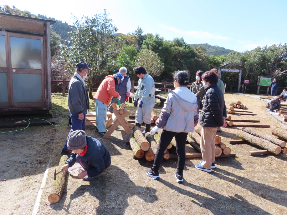 令和8年2月22日(日)、照葉樹の森椎茸コマ打ち体験教室が開催されました。雨が降りそうな天気予報でしたが、開始時間に合わせるように太陽が顔を出しちょうど良いコマ打ち日和になりました。毎年恒例のイベントなので常連さんも多く、手際よくコマ打ち体験を行い、嬉しそうにホダ木を持ち帰る皆様でした。管理方法栽培方法など、相談も受け付けています。参加者の皆様が、美味しいシイタケを収穫できるように願っております。